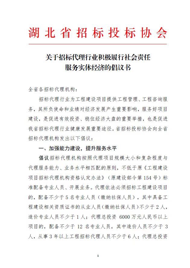关于招标代理行业积极履行社会责任 服务实体经济的倡议书
